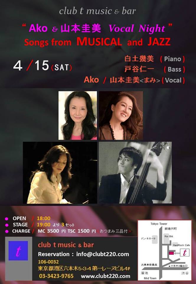 ♪ 地下鉄六本木駅からほど近い、東京タワーの夜景が美しく見渡せる素敵なジャズラウンジclub t . 落ち着いた雰囲気で、赤いソファーがとってもお洒落でシック。グランドピアノを囲んで、すばらしいミュージシャン、ヴォーカリストの皆さんが毎晩出演されています。♪